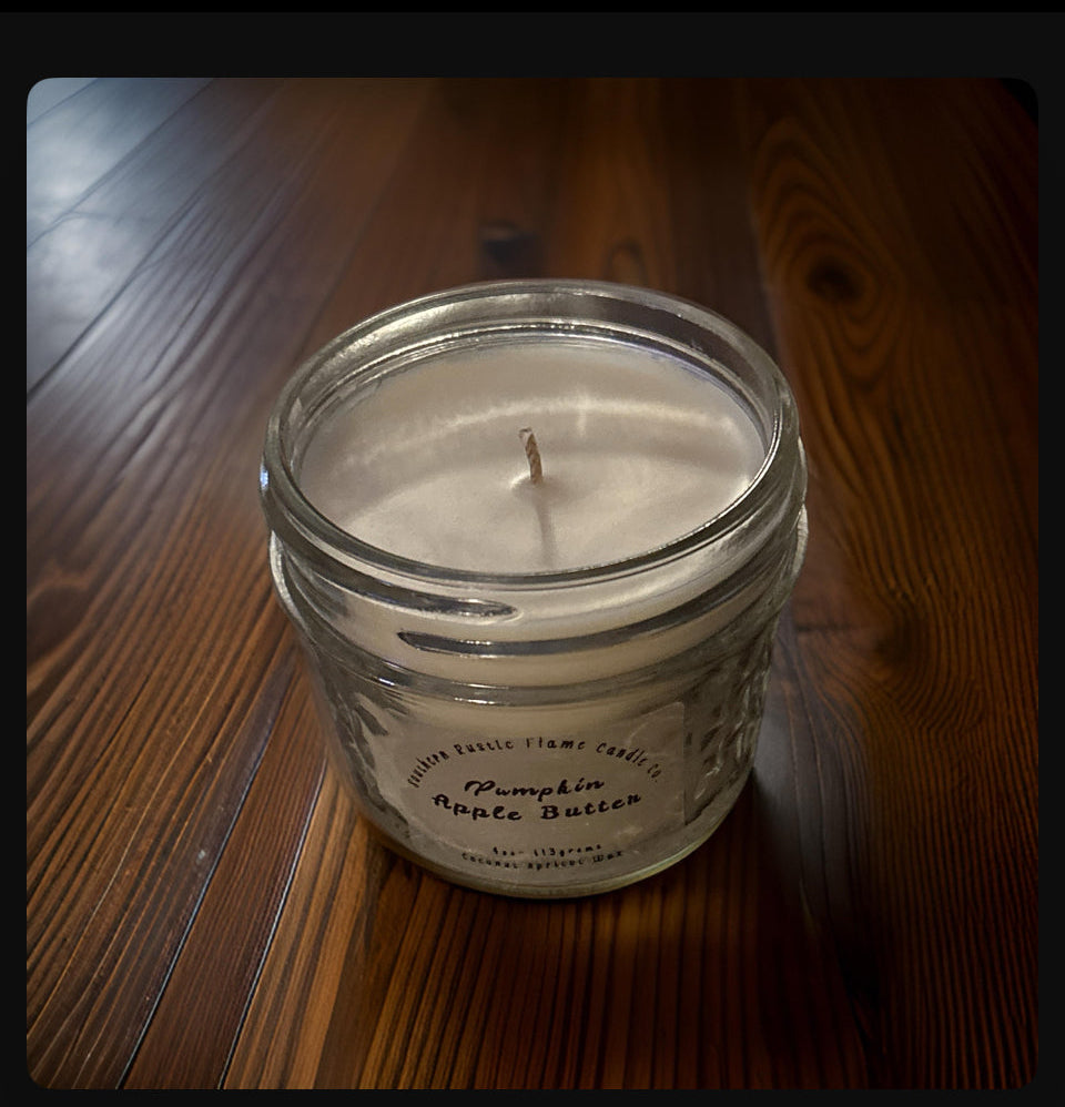 Experience the warm and inviting scent of Pumpkin Apple Butter with our 4 oz Mason Jar candle. Made with a blend of high-quality Coconut Apricot Wax, this candle offers a longer burn time and cleaner burn than traditional paraffin wax candles. Enjoy the golden glow and cozy aroma in any room of your home with our homemade scented candle.