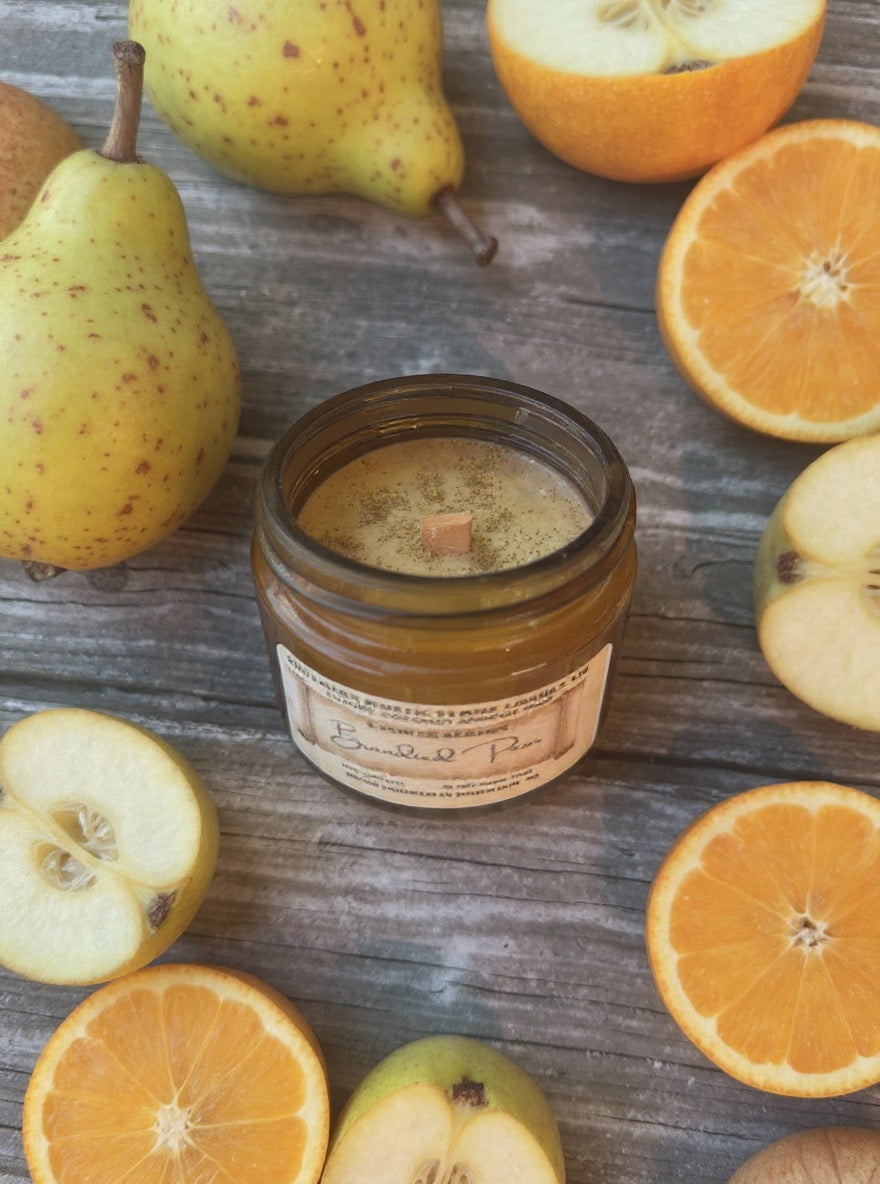 Discover the perfect balance of sweet and spicy with our Brandied Pear homemade candle. With the refreshing scent of juicy, sun-kissed pear, paired with the enchanting notes of florals and soothing musk, this 2oz homemade candle is sure to whisk you away on a whimsical adventure. Bring a burst of playful energy to any space with this bright and crisp fragrance. Made with luxury coconut apricot wax for longer clean burns & lasting rich aroma